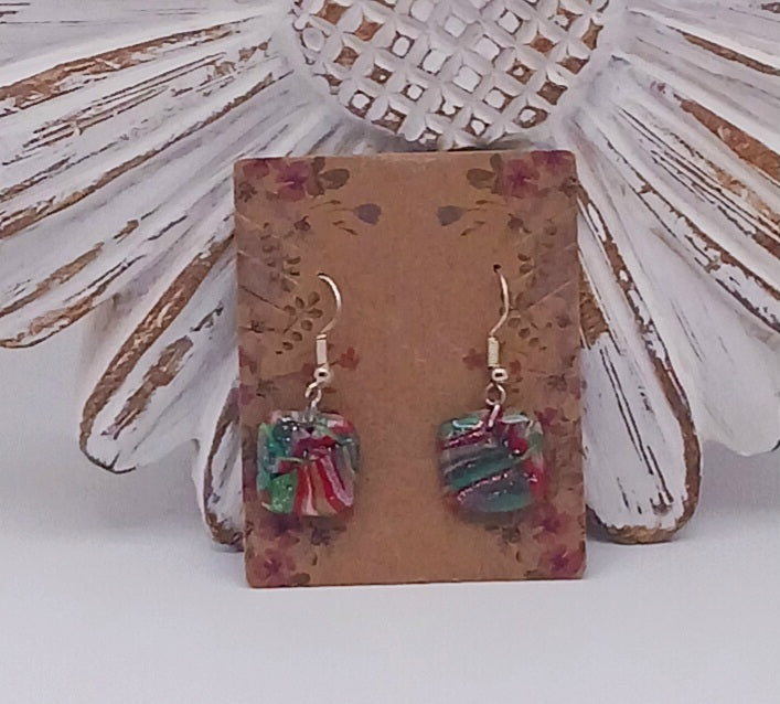Faux glass Christmas Earrings with silver components. Swirls of red, green and silver with resin finish. 1/2"W x 1/2"H x 1 1/2"L.