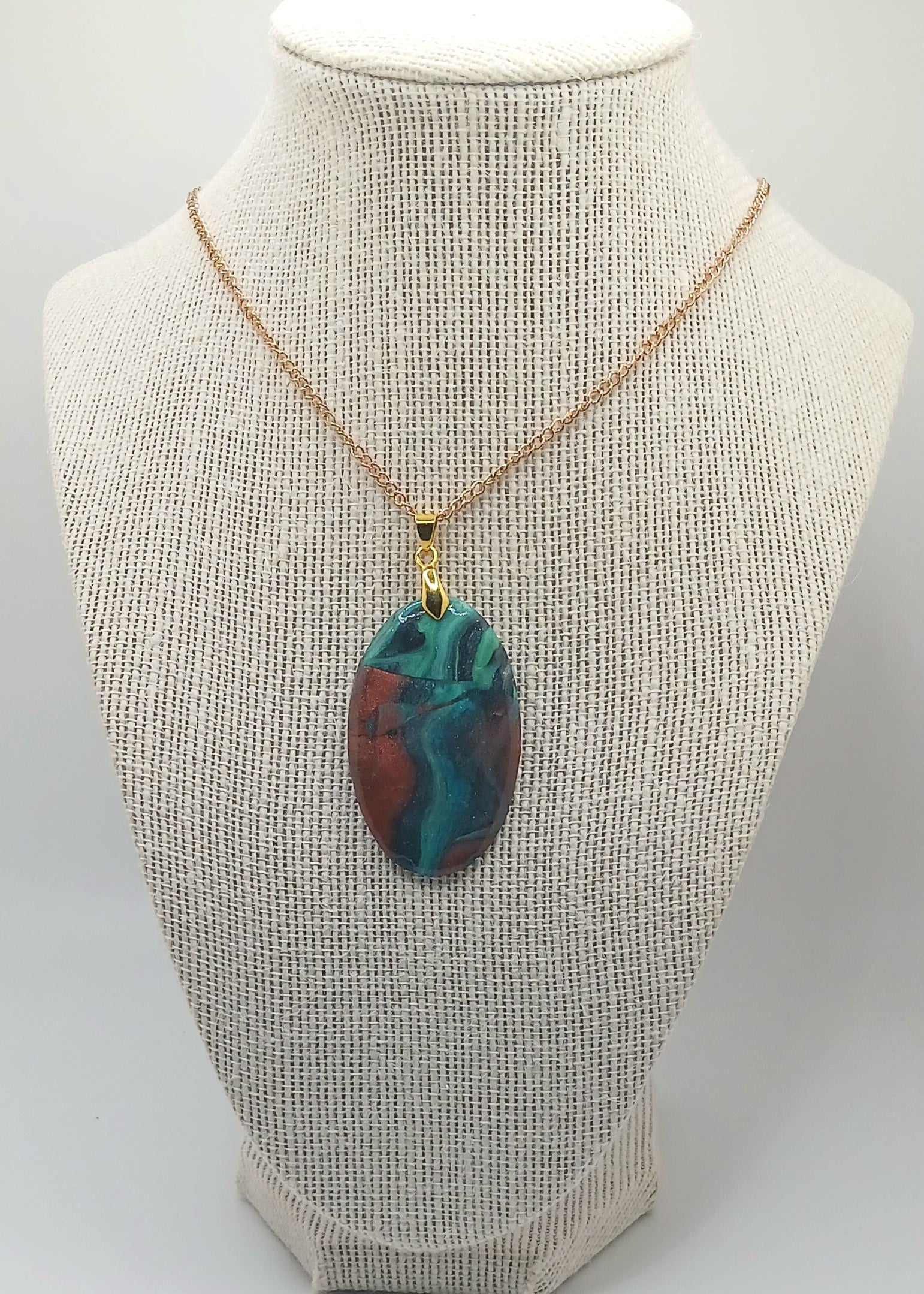 Layered abstract colors of copper, bronze, blues and greens paired with gold pinch bale, gold chain. Sealed with epoxy finish. Dimensions are 1 1/4" x 2" x 15".