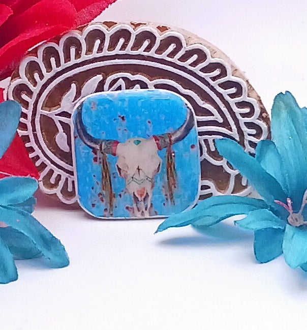 19mm square rounded corners. Rustic background. Resin on front and back. No holes.