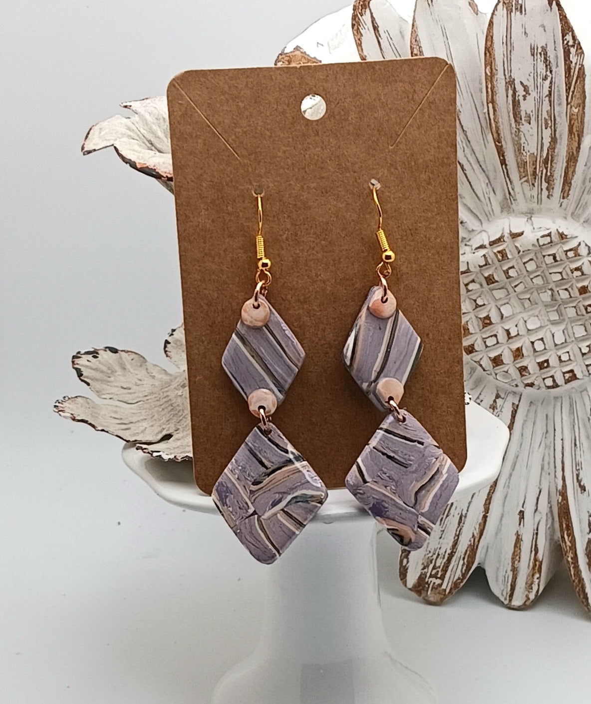 Lines of grey, lavender, peach black and white with handmade peach beads paired with gold components. Sealed with epoxy finish. Bottom dimensions 1"W x 1 1/4"H, top dimensions 3/4"W x 1"H, 3"L.