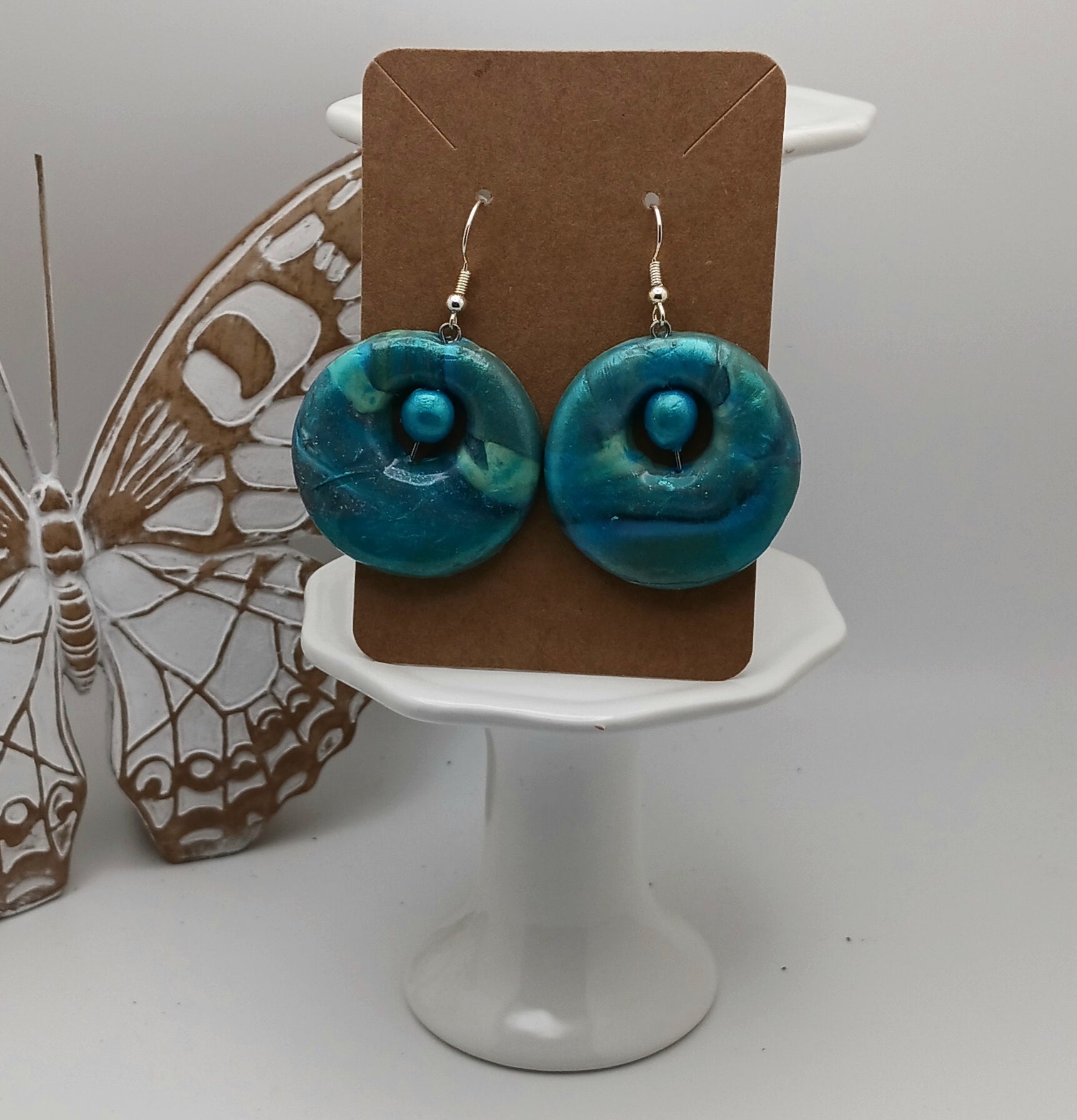 Donut holes with handmade beads, aquamarine blues with a two tone top layer, paired with silver components. Sealed with epoxy finish. 1 1/2"D x 2 1/8"L.
