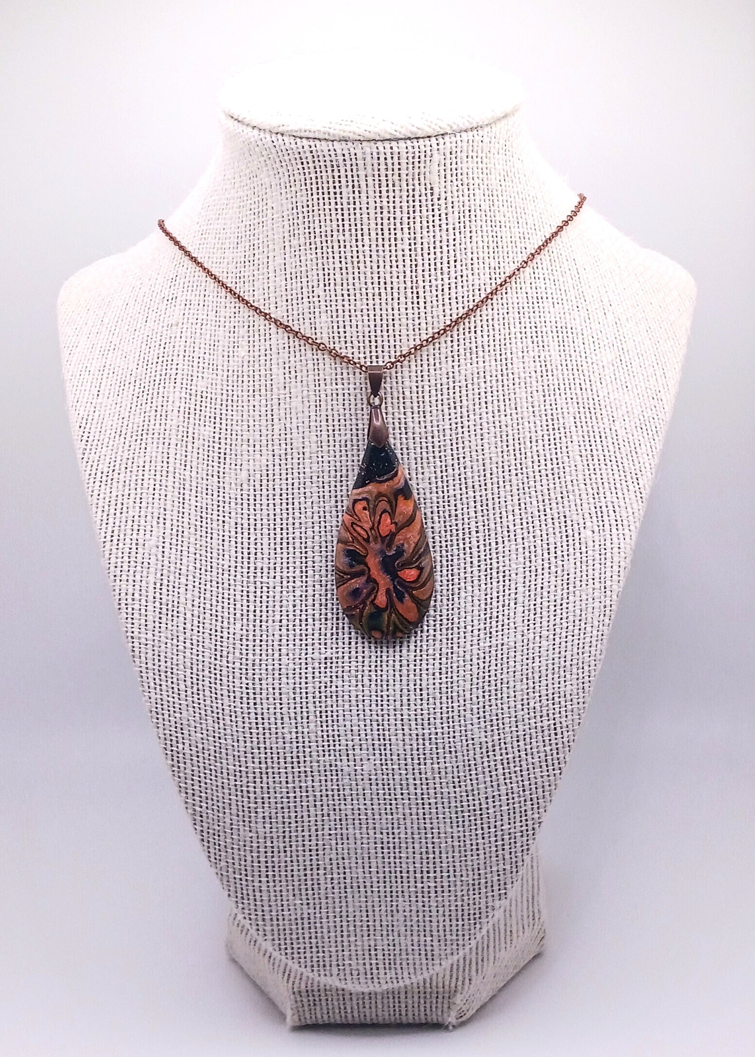 Layers of sunset pearl, orange, bronze over midnight black paired with bronze pinch bale and chain. Sealed with epoxy resin. Dimensions are 1" x 2 1/4" x 14".
