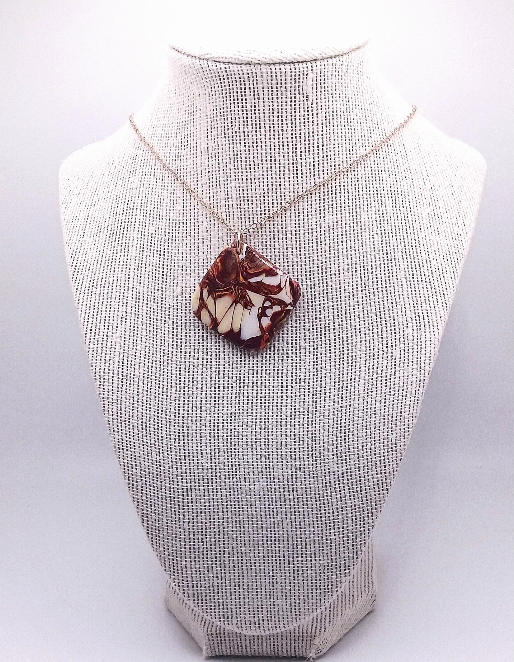 Wood grain motif with fractures of creamy petals paired with silver components and lobster clasp. Sealed with epoxy finish. Dimensions are 1 1/2" x 1 1/2" x 13".