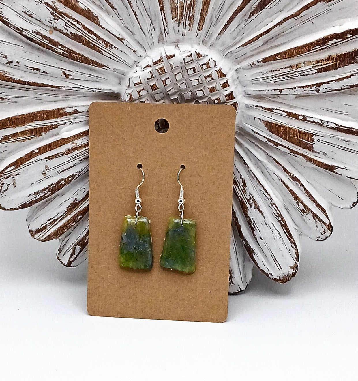 Flecks of jade and silver over translucent clay paired with silver components. Sealed with epoxy finish. 1/2"W x 3/4"H x 1 1/2"L.