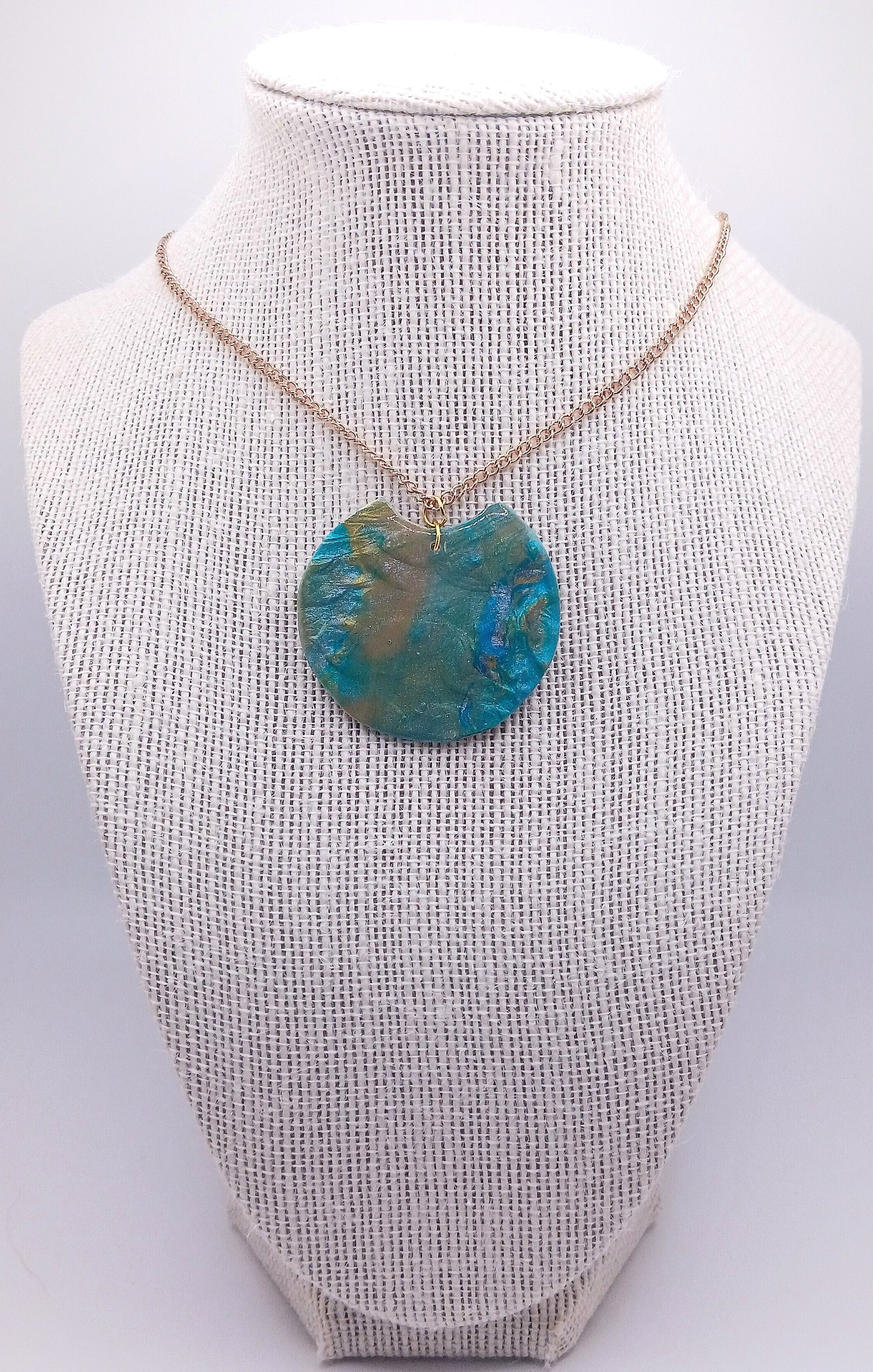 Mounds of turquoise, aquas, greens, bronze and gold mix paired with gold components. Sealed with epoxy finish. Dimensions are 1 3/4" x 1 5/8" x 12 1/2".
