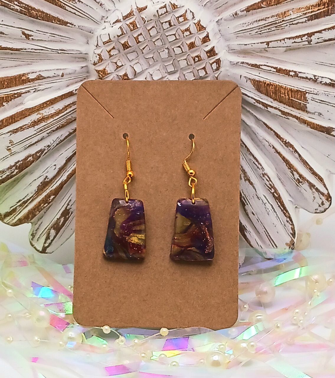 Layers of purple, Ruby Red, gold and bronze with complimenting gold components. Sealed with epoxy finish. 1/2"W x 3/4"H x 1 3/4"L.