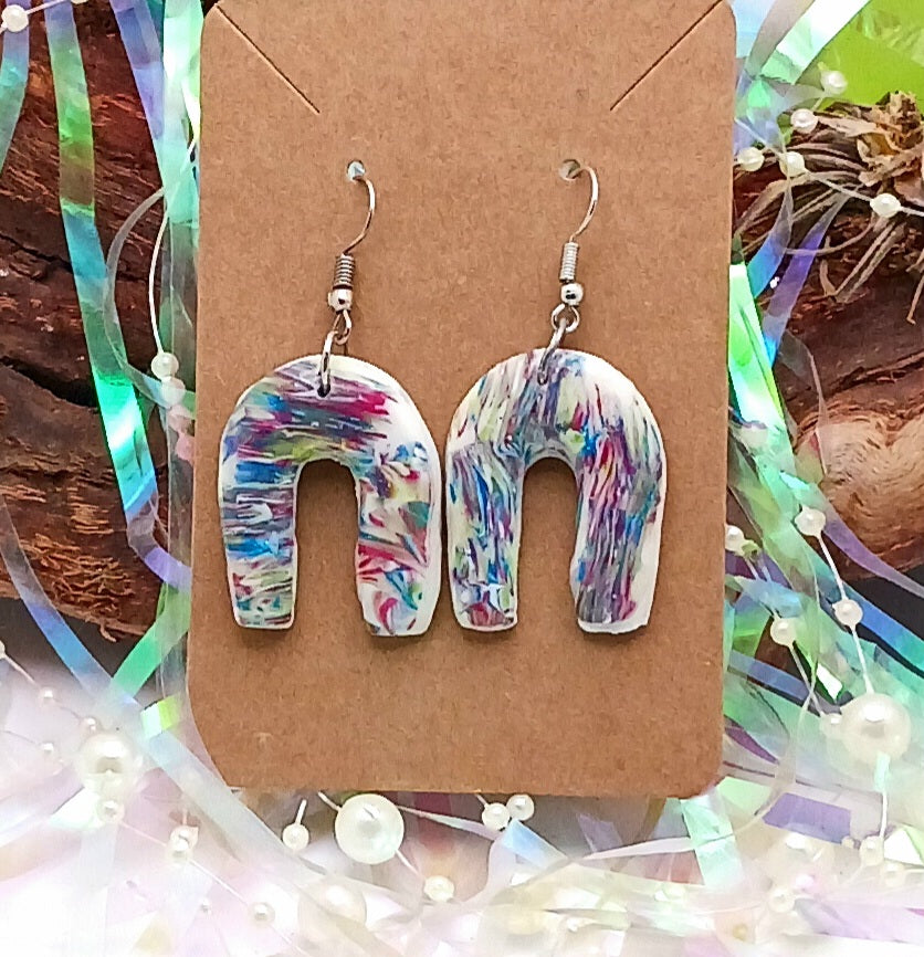 Horshoe earrings with brush strokes of rainbow colors with silver components. Sealed with epoxy finish. Dimensions are 1"W x 1 1/8"H x 2"L.