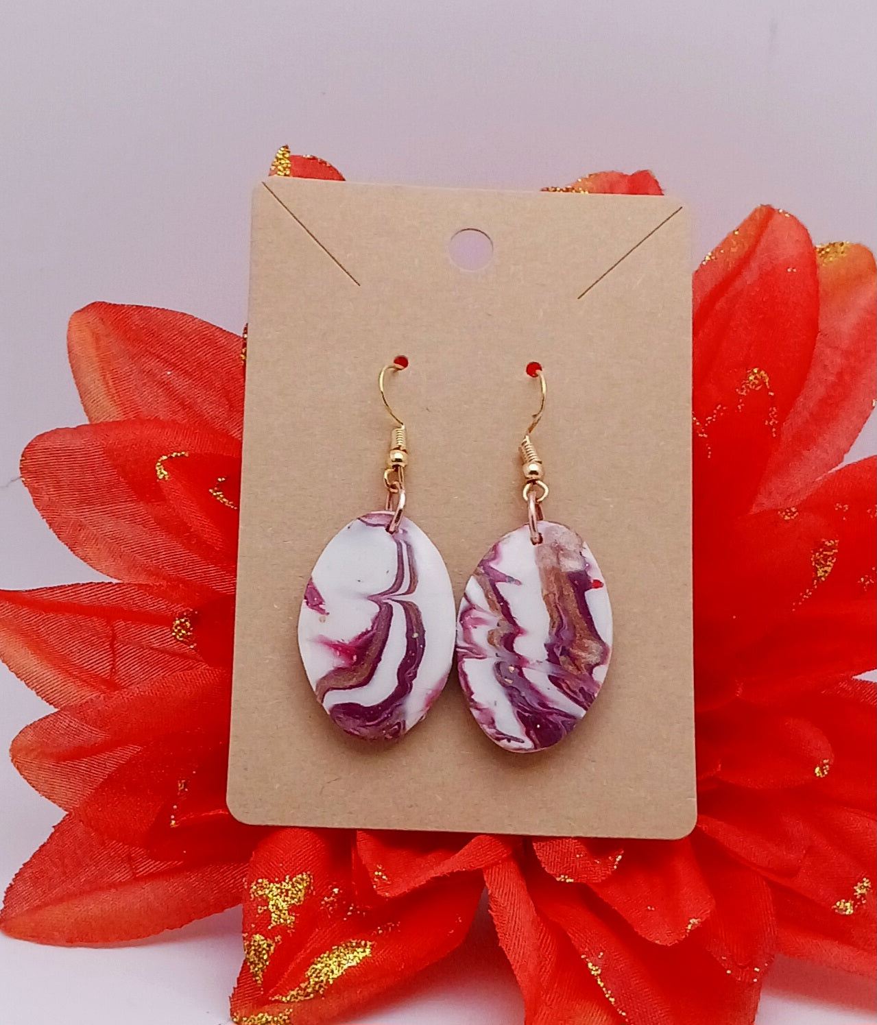 Fluid lines of pink, purple and gold accents. Gold components. Sealed with epoxy finish. Dimensions are 3/4"W x 1 1/4"H x 1 3/4"L.
