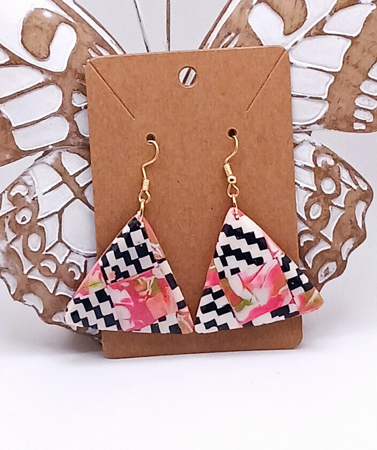 Triangle black and white diamonds with floral pattern. Paired with silver components.