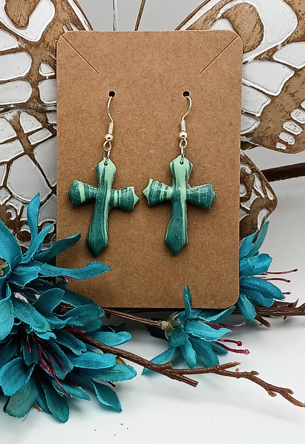 Feathered turquoise, aquamarine and pastel green earrings paired with silver components. 3/4"W x 1 1/4"H x 2"L.