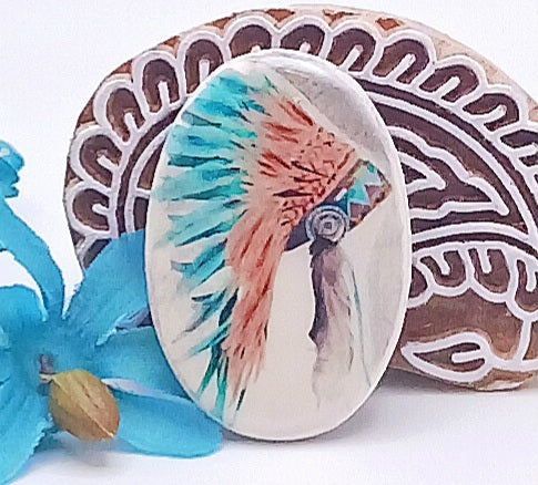 19mm oval pendant with a faint border of silver. Resin on front and back. No holes.