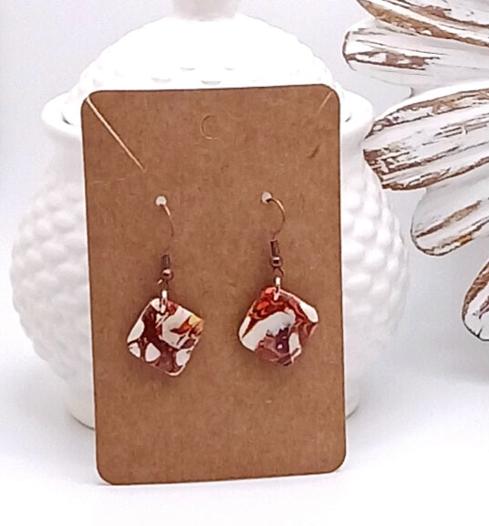 Hues of wood grain with mustard, red and burnt orange accents. Bronze components. Sealed with epoxy finish. 3/4"W x 3/4"H x 1 1/2"L.